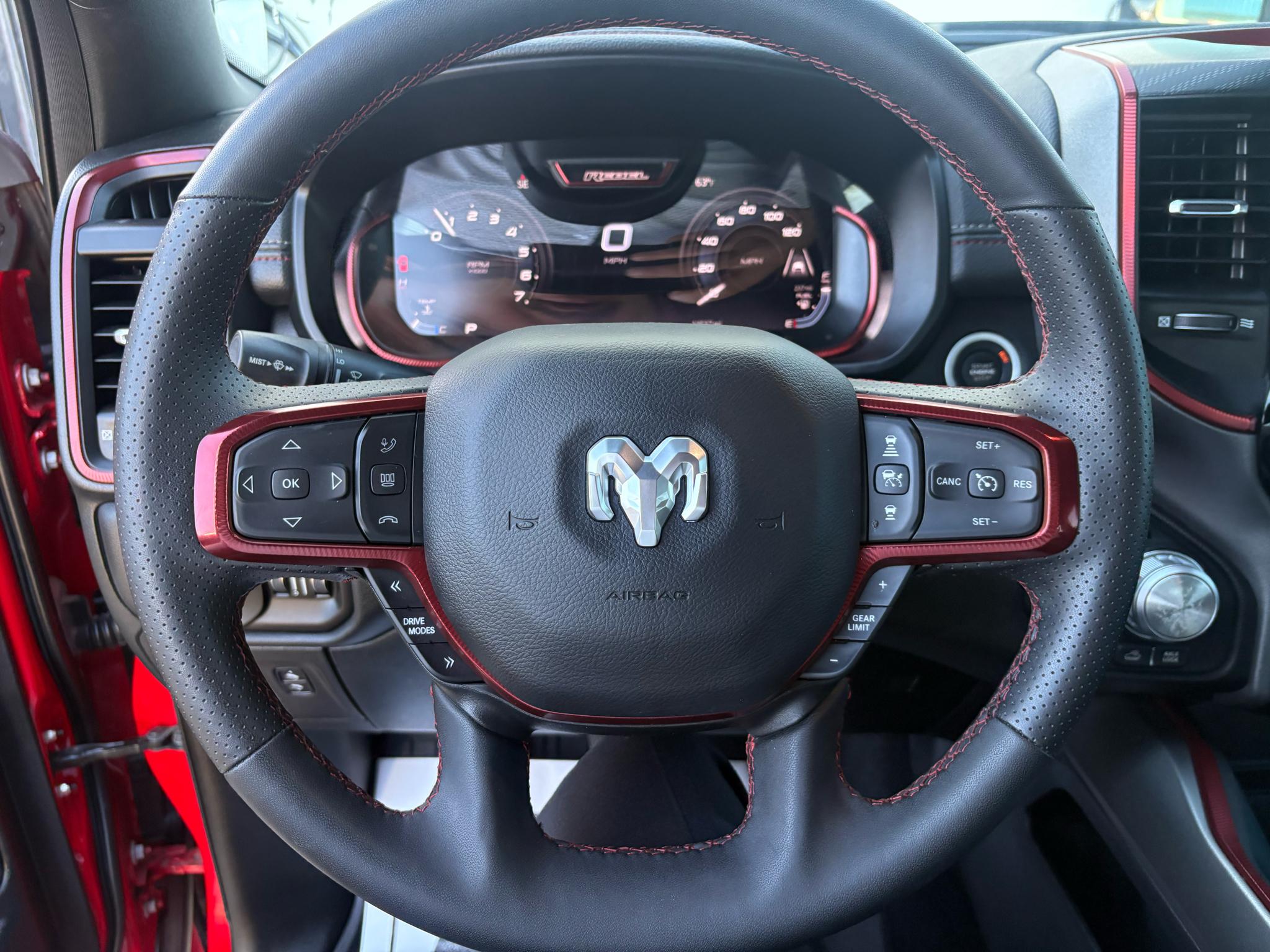 Get ready to tackle any adventure in this 2025 RAM 1500 with a 3.0L I6 Hurricane SO Twin Turbo ESS engine under the hood! Equipped with the capability to take on any terrain with its part-time four-wheel drive, driver-selectable rear locking differential, and off-road suspension, this truck is ready to conquer any challenge. With a sleek red exterior, this RAM 1500 stands out on the road, featuring black accents and 18" painted mid-gloss black wheels.